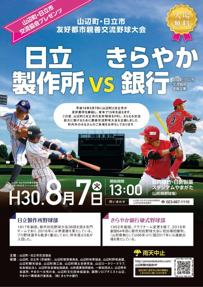 [本日の試合について](8/7更新)本日の親善交流野球大会は小雨決行となりましたのでお知らせいたします。雨具をご持参のうえご観覧ください。ただし、本降りの際は中止となる場合もございますのでご注意ください。 山辺町・日立市友好都市親善交流野球大会日立製作所VSきらやか銀行(山辺町・日立市交流協会会員企業) 平成16年5月7日に山辺町と日立市が友好都市を締結し、来年で15年を迎えます。この度、山辺町と日立市の友好関係をPRし、さらなる交流拡大に繋げるために親善交流野球大会を企画いたしました。多くの皆さまのご来場をお待ちしております。□日 時 平成30年8月7日(火) 13:00開始□場 所 荘内銀行・日新製薬スタジアムやまがた(山形県野球場)□入場料 無料□主 催 山辺町・日立市交流協会□問合せ 山辺町・日立市交流協会事務局(山辺町政策推進課内) TEL 023-667-1110