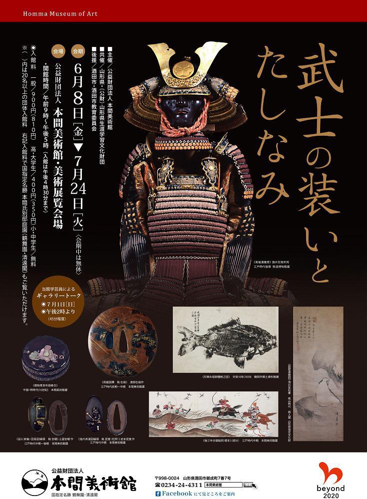 6月8日より、企画展「武士の装いとたしなみ」(7/24まで)が始まりました。この展覧会では、武士の装いとたしなみとともに、武士が描かれた絵巻や屏風をご紹介し、武士の実像に迫ります。   武士が身につけていた甲冑や刀剣、刀装具などの装いには、彼らの美意識や祈りを感じられるものがあります。    武士のなかには、絵画や茶の湯をたしなみとし、刀を筆に持ちかえて画家として活躍をしたり、茶道具を蒐集する者もいました。    昨年当館に里帰りした名刀《太刀 銘月山作》(酒田市指定文化財)をはじめ、平安時代から江戸時代中期までの日本刀、戦国時代末期に主流となった「変わり兜」の一つ《蒙古型兜》(酒田市資料館蔵)、当館では初となる「直接法」による日本最古の魚拓《於錦糸堀御獲鮒之図》(鶴岡市郷土資料館蔵)と「間接法」による日本最古の魚拓《紅鯛》(当館蔵)の同時展示など、見どころが満載となっています。