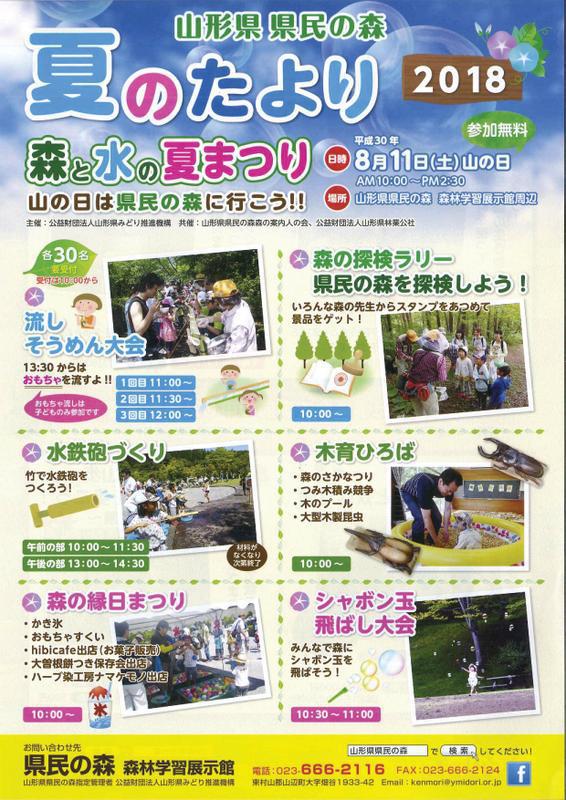 8月11日は「山の日」。山の日は県民の森にいこう!!8月11日(土)は、県民の森にて『森と水の夏まつり』を開催します。当日は水を使った様々なイベントが行われます。また、県民の森では様々な行事も開催しています。暑い天気が続いていますが、ご家族皆さんで自然豊かな森の中に出かけてみませんか♪  『森と水の夏まつり』□日 時  平成30年8月11日(土・山の日)□時 間  AM10:00〜PM2:30□場 所  県民の森森林学習展示館周辺□イベント内容  流しそうめん 森の探検ラリー 水鉄砲づくり 木育ひろば 森の縁日まつり シャボン玉飛ばし大会 ※当日受付が必要なイベントもあります。詳しくは県民の森にお問合せ下さい。□お問合せ先  県民の森森林学習展示館  電話:023−666−2116  FAX:023−666−2124また、県民の森では、『フォトコンテスト2018』の写真募集を行っています。四季折々の様々な風景や、県民の森で思い思いに過ごす人々の様子等をカメラに収めてみませんか!なお、最優秀賞に輝いた方には、賞状と賞金3万円が贈られます。その他、多数の賞も準備しています。 □応募期間  平成30年6月1日〜9月30日 □撮影対象  県民の森エリア内で撮影された森林や湖沼、人々の様子 □応募資格  特に限定しませんが、作品は自作、未発表のものにかぎります。
