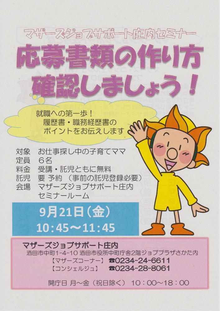 9月『マザーズジョブサポート庄内 求職支援セミナー』『応募書類の作り方確認しましょう!』を行います! このセミナーは就職への第一歩!履歴書・職務経歴書のポイントをお伝えします。 ハローワークマザーズコーナーでは定期的にセミナーを開催します。奮ってご参加下さい。受講後も疑問点など、窓口にてご相談が受けられます。☆雇用保険受給者の方は求職活動実績にカウント出来ます☆ 【日 時】9月21日(金) 10時45分〜11時45分【対 象】お仕事探し中の子育てママさん【会 場】マザーズジョブサポート庄内 セミナールーム【料 金】受講料 及び 託児料 無料【定 員】先着6名 ※お申込みが必要です。【託 児】定員6名 ※事前登録・予約が必要です。 ※併設の保育ルームで、保育スタッフがお子さんを お預かりします。ママは安心して受講いただけます。 【駐車場について】 お車でお越しの際は、中町庁舎脇にある 〈セントラルホテル契約駐車場〉をご利用ください。 (ジョブプラザさかたと表示してあります。) ※契約駐車場が満車の場合は、 酒田市中央地下駐車場をご利用ください。 地下駐車場をご利用の方は、無料駐車券を発行いたします。 お帰りの際に、マザーズ窓口へお声がけください。 どうぞ、お気軽にお問い合わせくださいね。 ◇お申込み・お問い合わせ◇マザーズジョブサポート庄内TEL:0234-24-6611(マザーズコーナー)TEL:0234-28-8061(コンシェルジュコーナー)開庁日 月〜金(祝日除く)10:00〜18:00