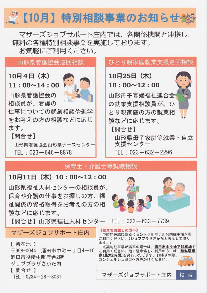 マザーズジョブサポート庄内では、各関係機関と連携し、各種特別相談事業を実施しております。ぜひ、ご利用ください。 山形県看護協会巡回相談 ※お申し込み不要 日時 10月4日(木)11:00〜14:00 場所 マザーズジョブサポート庄内 セミナールーム 問合せ 山形県看護協会 пF023-646-8878 HP:http://www.nurse-yamagata.or.jp/ 看護の仕事への復職をお考えの方、お気軽にご相談ください 保育士・介護士等就職相談 ※お申し込み不要 日時 10月11日(木)10:00〜12:00 場所 マザーズジョブサポート庄内 セミナールーム 問合せ 山形県福祉人材センター пF023-633-7739 HP:http://www.ymgt-shakyo.or.jp/jinzai/ 保育士・介護士・看護師など資格をお持ちの方や、 資格取得を目指している方、福祉職にご関心のある方は お気軽にお越しください。 ひとり親家庭就業支援相談 [要予約] 日時 10月25日(木)10:00〜12:00 場所 マザーズジョブサポート庄内 セミナールーム 問合せ 山形県母子家庭等就業・自立支援センター пF023-632-2296 HP:http://www.y-boshi.com/self-support/ ひとり親家庭の方や今後について考えている方、 どうぞお気軽にお越しください。 ※ご利用希望の方は、マザーズジョブサポート庄内への ご登録が必要となります。 ※ご相談の際、お子さまの託児は『保育ルームきらきら』を ご利用いただけます。 事前にご予約が必要です。 ※各相談会について、利用ご希望の方は、 マザーズジョブサポート庄内 マザーズ・コンシェルジュまで お気軽にお声掛けください。※ご相談の際、お子さまの託児は『保育ルーム きらきら』をご利用いただけます。 託児ルームのご利用には、事前のご登録が必要です。 【駐車場について】 お車でお越しの際は、中町庁舎脇にある 〈セントラルホテル契約駐車場〉をご利用ください。 (ジョブプラザさかたと表示してあります。) ※契約駐車場が満車の場合は、 酒田市中央地下駐車場をご利用ください。 地下駐車場をご利用の方は、無料駐車券(最大2時間)を 発行いたします。 お帰りの際に、コンシェルジュ窓口へお声がけください。 ◇お申込み・お問い合わせ◇マザーズジョブサポート庄内TEL:0234-28-8061
