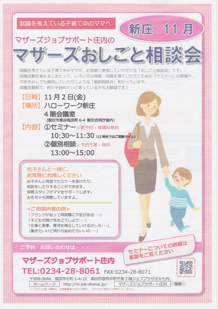 吹く風が日増しに寒く感じられるようになってきました。体調管理にはお気を付けくださいね。 ハローワーク新庄『おしごと相談会』を開催します。 【日時と内容】■ 11月2日(金) 10:30〜11:30 セミナー ※お申込みが必要です。 「働く準備をしよう!」 自分は何のために働くのか、働くメリット、デメリットを考え 働くにあたっての優先条件を整理しながら働く準備をしてみませんか? 11:30〜12:00 セミナー参加者個別相談会 ※希望者のみ、お申し込み不要 13:00〜15:00 個別相談会 ※どなたでもご利用いただけます、お申込みは不要です。 直接『4階 会議室』へお越しください♪ ・おしごとに関するお悩み ・子育てに関すること ・仕事と家事、子育てとの両立 など、お気軽にご相談ください。 お子さんと一緒に、お気軽にお越しください。お子さんと同じお部屋でセミナーを受講し、相談することができます。保育スタッフが、お子さんを見守りいたします。 ◇お申込み・お問い合わせ◇ マザーズジョブサポート庄内 TEL:0234-28-8061