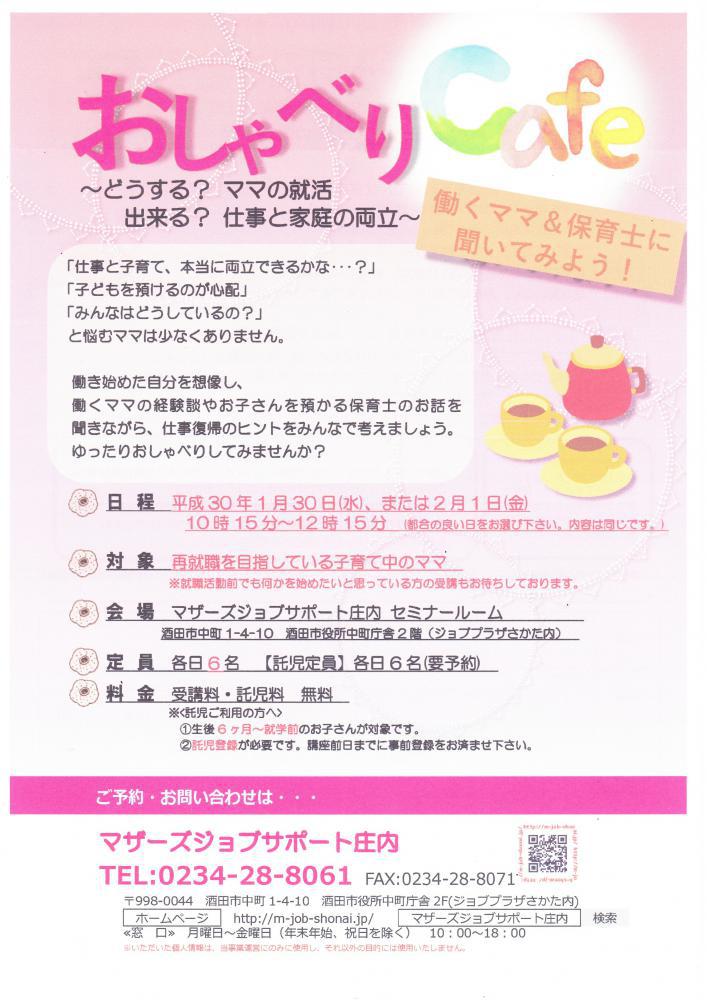 『おしゃべりCafe ~どうする?ママの就活できる?仕事と家庭の両立~』のお知らせです。「仕事と子育て、本当に両立できるかな…?」「子どもを預けるのが心配」「みんなはどうしているの?」と悩むママは少なくありません。働き始めた自分を想像し、働くママの経験談やお子さんを預かる保育士のお話を聞きながら、仕事復帰のヒントをみんなで考えましょう。ゆったりおしゃべりしてみませんか。 【日 時】1月30日(水)または 2月1日(金) 10時15分〜12時15分 ※内容は同一です。いずれかの日にちをお選びください。【対 象】就職を目指している子育て中のママ ※就職活動前で何かを始めたい方でもOK【会 場】マザーズジョブサポート庄内 セミナールーム【料 金】受講料 及び 託児料 無料【定 員】先着6名 ※お申込みが必要です。【託 児】定員6名 ※事前登録・予約が必要です。 ※併設の保育ルームで、保育スタッフがお子さんを お預かりします。ママは安心して受講いただけます。 ※本セミナーは「雇用保険受給中の求職活動実績」として認められます。 【駐車場について】 お車でお越しの際は、中町庁舎脇にある 〈セントラルホテル契約駐車場〉をご利用ください。 (ジョブプラザさかたと表示してあります。) ※契約駐車場が満車の場合は、 酒田市中央地下駐車場をご利用ください。 地下駐車場をご利用の方は、無料駐車券(最大2時間)を 発行いたします。 お帰りの際に、コンシェルジュ窓口へお声がけください。 どうぞ、お気軽にお問い合わせくださいね。 ●お問合せは●マザーズジョブサポート庄内TEL:0234-28-8061FAX:0234-28-8071