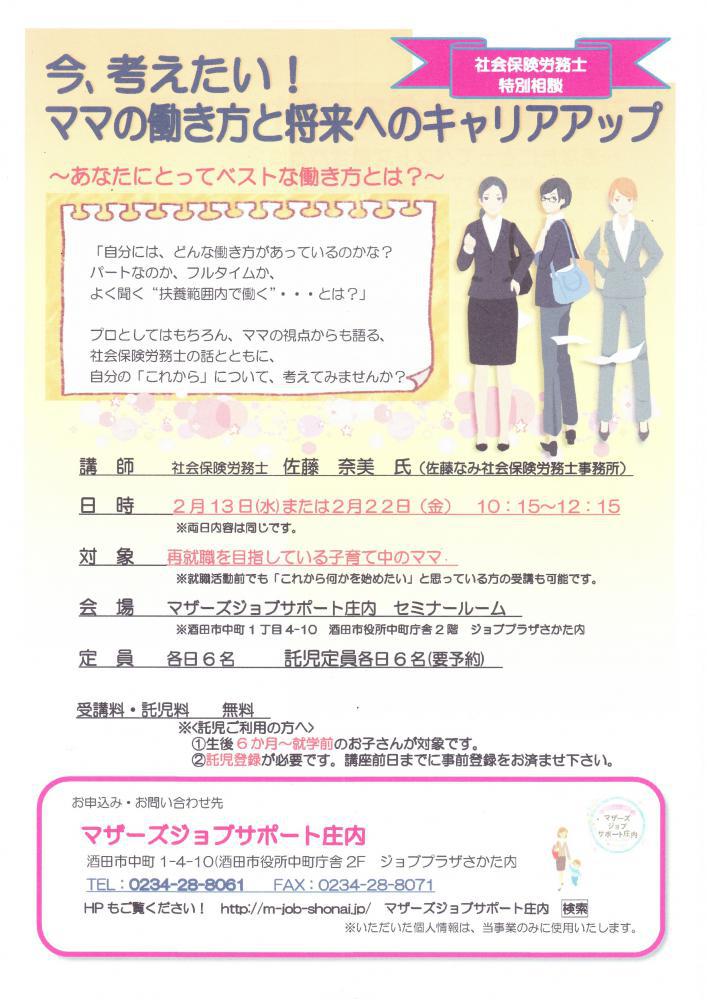 マザーズジョブサポート庄内主催『今、考えたい!ママの働き方と将来へのキャリアアップ』セミナーを開催します! 「自分にはどんな働き方があっているのかな?」「よく聞く"扶養の範囲内で"働くって…?」プロとしてはもちろんママの視点からも語る、社会保険労務士の話とともに自分の『これから』について考えてみませんか? 【日 時】 2月13日(水)または2月22日(金) 10時15分〜12時15分 ※内容は同じです、どちらかの日にちをお選びください。【対 象】 就職を目指している子育て中のママ ※就職活動前でも何かを始めたいと思っているママもOK【会 場】 マザーズジョブサポート庄内 セミナールーム【料 金】 無料【定 員】 先着6名 ※お申込みが必要です。【託 児】 定員6名 ※事前にご登録と利用予約が必要です。 ※併設の保育ルームで、保育スタッフがお子さんを お預かりします。ママは安心して受講いただけます。 【駐車場について】 お車でお越しの際は、中町庁舎脇にある 〈セントラルホテル契約駐車場〉をご利用ください。 (ジョブプラザさかたと表示してあります。) ※契約駐車場が満車の場合は、 酒田市中央地下駐車場をご利用ください。 地下駐車場をご利用の方は、無料駐車券(最大2時間)を 発行いたします。 お帰りの際に、コンシェルジュ窓口へお声がけください。 どうぞ、お気軽にお問い合わせくださいね。 ◇お申込み・お問い合わせ◇ マザーズジョブサポート庄内 TEL:0234-28-8061