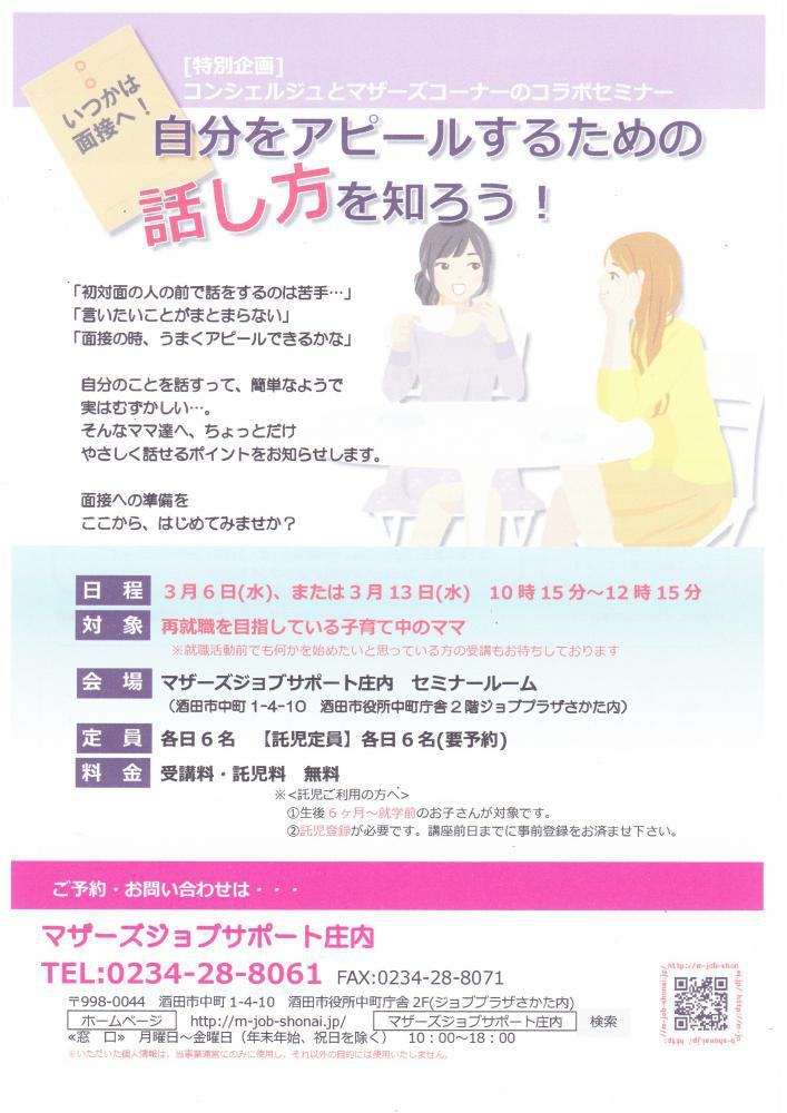 【特別企画】コンシェルジュとマザーズコーナーのコラボセミナー『自分をアピールするための話し方を知ろう!』のお知らせです。 「初対面の人の前で話をするのは苦手…」「言いたいことがまとまらない」「面接の時、うまくアピールできるかな」自分のことを話すって、簡単なようで実は難しい…。そんなママ達へ、ちょっとだけやさしく話せるポイントをお知らせします。面接の準備をここから、はじめてみませんか? 【日 時】3月6日(水) または 13日(水) 10時15分〜12時15分 ※内容は同一です。いずれかの日にちをお選びください。【対 象】就職を目指している子育て中のママ ※就職活動前で何かを始めたい方でもOK【会 場】マザーズジョブサポート庄内 セミナールーム【料 金】受講料 及び 託児料 無料【定 員】先着6名 ※お申込みが必要です。【託 児】定員6名 ※事前登録・予約が必要です。 ※併設の保育ルームで、保育スタッフがお子さんを お預かりします。ママは安心して受講いただけます。 【駐車場について】 お車でお越しの際は、中町庁舎脇にある 〈セントラルホテル契約駐車場〉をご利用ください。 (ジョブプラザさかたと表示してあります。) ※契約駐車場が満車の場合は、 酒田市中央地下駐車場をご利用ください。 地下駐車場をご利用の方は、無料駐車券(最大2時間)を 発行いたします。 お帰りの際に、コンシェルジュ窓口へお声がけください。 どうぞ、お気軽にお問い合わせくださいね。 ●お問合せは●マザーズジョブサポート庄内TEL:0234-28-8061FAX:0234-28-8071