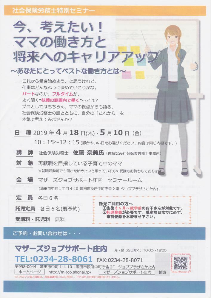 ☆彡今考えたい! ママの働き方と将来へのキャリアアップ☆彡 〜あなたにとってベストな働き方とは〜「自分にはどんな働き方があっているのかな?」「よく聞く"扶養の範囲内で"働くって…?」プロとしてはもちろんママの視点からも語る社会保険労務士の話とともに自分の『これから』について考えてみませんか?【日 時】4月18日(木)または5月10日(金) 10時15分〜12時15分 ※都合のいい日をお選びください。内容は同じ内容です。【対 象】就職を目指している子育て中のママ ※就職活動前でも何かを始めたいと思っているママもOK【会 場】マザーズジョブサポート庄内 セミナールーム【受講料・託児料】無料【定 員】各日先着6名【託児定員】各日最大6名 ※事前にご登録と利用予約が必要です。【駐車場について】 お車でお越しの際は、中町庁舎脇にある 〈セントラルホテル契約駐車場〉をご利用ください。 (ジョブプラザさかたと表示してあります。) ※契約駐車場が満車の場合は、 酒田市中央地下駐車場をご利用ください。 地下駐車場をご利用の方は、無料駐車券(最大2時間)を 発行いたします。 お帰りの際に、コンシェルジュ窓口へお声がけください。 ◇お申込み・お問い合わせ◇ マザーズジョブサポート庄内 TEL:0234-28-8061