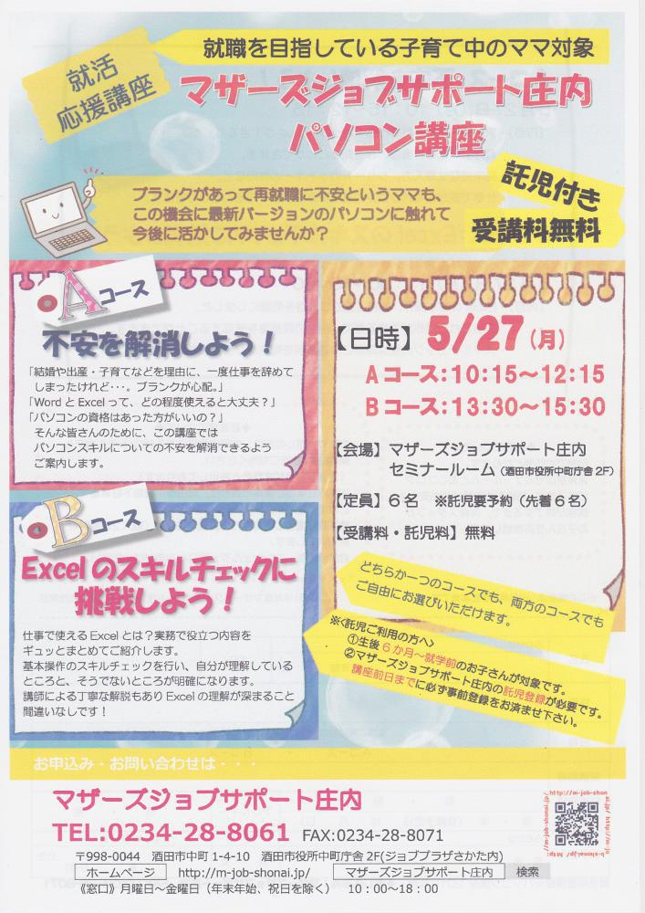 ☆マザーズジョブサポート庄内主催☆再就職応援 『パソコン講座』のお知らせ   ◇Aコース◇    5月27日(月)10:15〜12:15  『不安を解消しよう!』   「結婚や出産・子育てなどを理由に、   一度仕事をやめてしまったけれど…。ブランクが心配。」   「WordとExcelって、どの程度使えると大丈夫?」   「パソコンの資格はあったほうがいいの?」   そんな皆さんのために、この講座では   パソコンスキルについての不安を解消できるようご案内します。        ◇Bコース◇    5月27日(月)13:30〜15:30  『Excelのスキルチェックに挑戦しよう!』         仕事で使えるExcelとは?実務で役立つ内容を   ギュッとまとめてご紹介します。   基本操作のスキルチェックを行い、自分が理解しているところと   そうでないところが明確になります。   講師による丁寧な解説もありExcelの理解が深まること   間違いなしです!     ♪片方のコースのみ、両方のコース、どちらの受講でも可能です♪ ※本セミナーは「雇用保険受給中の求職活動実績」として認められます。 【対 象】就職を目指している子育て中のママ        ※就職活動前で何かを始めたい方でもOK【会 場】マザーズジョブサポート庄内 セミナールーム【料 金】受講料 及び 託児料 無料【定 員】先着6名 ※お申込みが必要です。【託 児】定員6名 ※事前登録・予約が必要です。                     ※併設の保育ルームで、保育スタッフがお子さんを          お預かりします。ママは安心して受講いただけます。  【駐車場について】お車でお越しの際は、中町庁舎脇にある〈セントラルホテル契約駐車場〉をご利用ください。(ジョブプラザさかたと表示してあります。)※契約駐車場が満車の場合は、酒田市中央地下駐車場をご利用ください。地下駐車場をご利用の方は、無料駐車券(最大2時間)を発行いたします。お帰りの際に、コンシェルジュ窓口へお声がけください。  お気軽にお問い合わせください♪ ◇お申込み・お問い合わせ◇マザーズジョブサポート庄内TEL:0234-28-8061