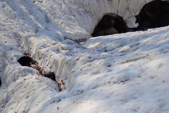 石跳川雪融けで危険です。リュウキンカ広場行きの橋。