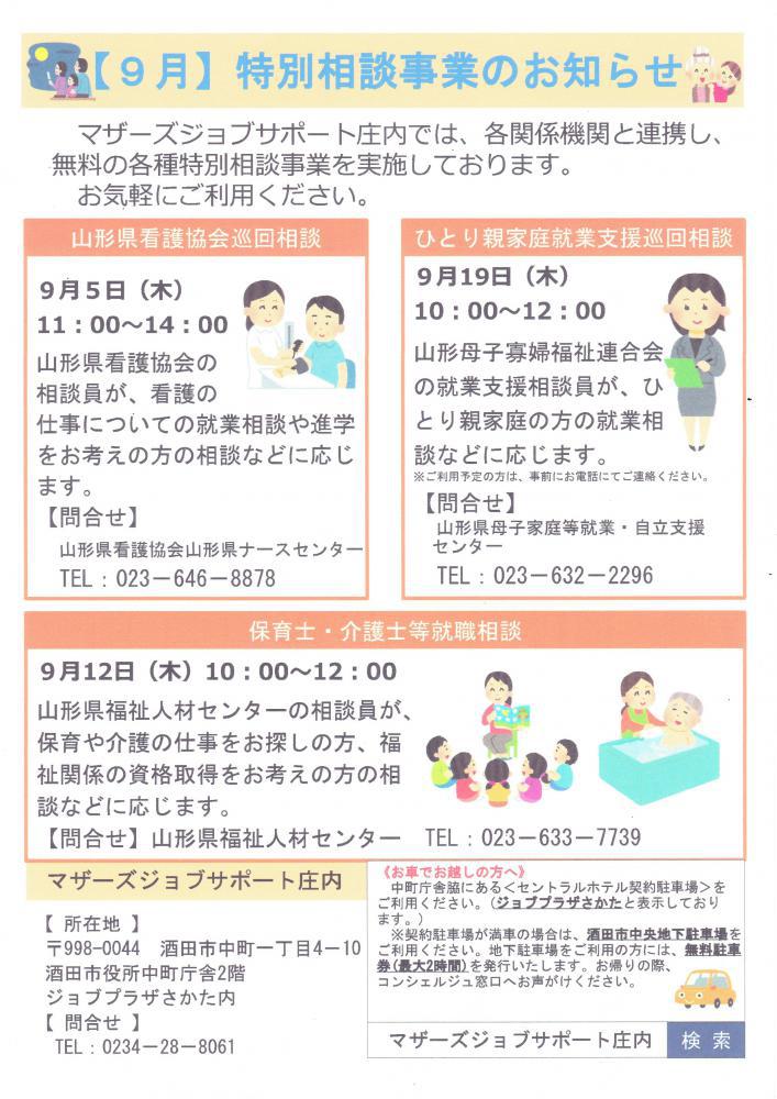 マザーズジョブサポート庄内では、各関係機関と連携し、各種特別相談事業を実施しております。ぜひ、ご利用ください。 山形県看護協会巡回相談 ※お申し込み不要日 時 9月5日(木)11:00〜14:00場 所 マザーズジョブサポート庄内 セミナールーム問合せ 山形県看護協会 пF023-646-8878HP:http://www.nurse-yamagata.or.jp/ 看護の仕事への復職をお考えの方、お気軽にご相談ください。 保育士・介護士等就職相談 ※お申し込み不要日 時 9月12日(木)10:00〜12:00場 所 マザーズジョブサポート庄内 セミナールーム 問合せ 山形県福祉人材センター пF023-633-7739HP:http://www.ymgt-shakyo.or.jp/jinzai/ 保育士・介護士・看護師など資格をお持ちの方や、資格取得を目指している方、福祉職にご関心のある方はお気軽にお越しください。 ひとり親家庭就業支援相談 [要予約]日 時 9月19日(木)10:00〜12:00場 所 マザーズジョブサポート庄内 セミナールーム問合せ 山形県母子家庭等就業・自立支援センター пF023-632-2296HP:http://www.y-boshi.com/self-support/ ひとり親家庭の方や今後について考えている方、どうぞお気軽にお越しください。 ※ご利用希望の方は、マザーズジョブサポート庄内へのご登録が必要となります。※ご相談の際、お子さまの託児は『保育ルームきらきら』をご利用いただけます。事前にご予約が必要です。 ※各相談会について、利用ご希望の方は、マザーズジョブサポート庄内 マザーズ・コンシェルジュまでお気軽にお声掛けください。※ご相談の際、お子さまの託児は『保育ルーム きらきら』をご利用いただけます。託児ルームのご利用には、事前のご登録が必要です。 【駐車場について】お車でお越しの際は、中町庁舎脇にある〈セントラルホテル契約駐車場〉をご利用ください。(ジョブプラザさかたと表示してあります。)※契約駐車場が満車の場合は、酒田市中央地下駐車場をご利用ください。酒田市中央地下駐車場をご利用の方は、無料駐車券(最大2時間)を発行いたします。お帰りの際に、コンシェルジュ窓口へお声がけください。 ◇お申込み・お問い合わせ◇マザーズジョブサポート庄内TEL:0234-28-8061