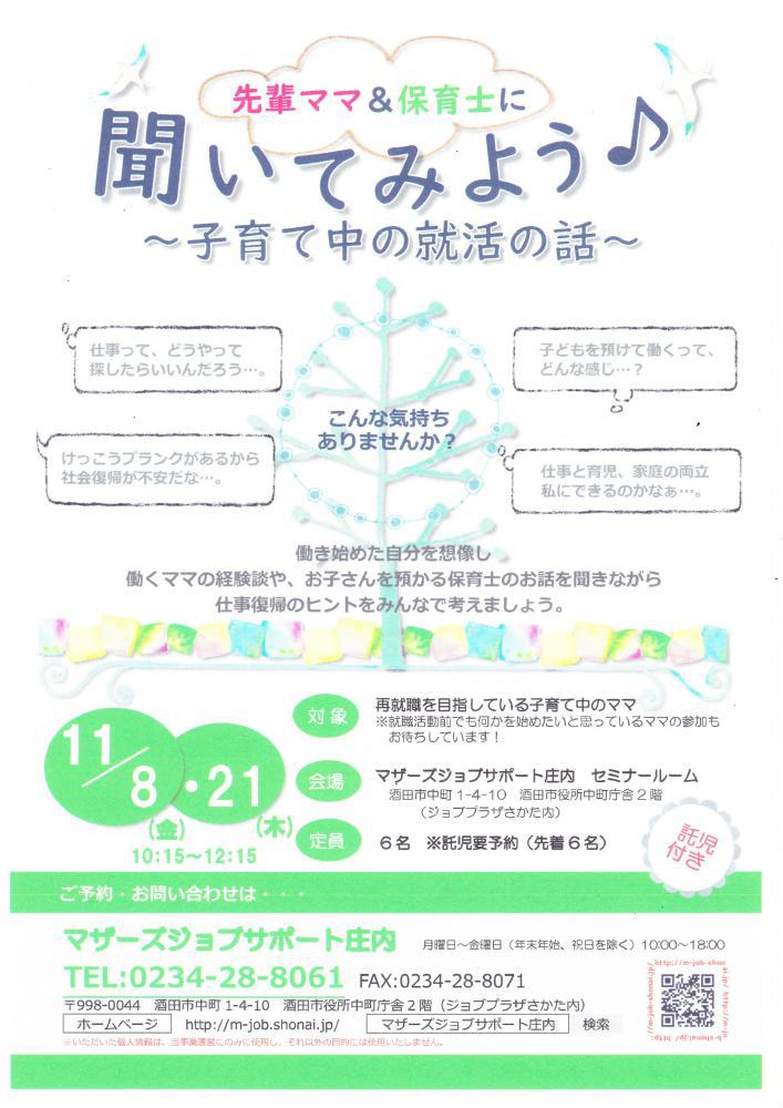 ☆☆新企画☆☆『先輩ママ&保育士に聞いてみよう♪〜子育て中の就活の話〜』のお知らせです。 「ママになってどうやって就活を進めたらいいの?」「子どもを保育所に預けて働くってどんな感じ?」「仕事と家庭をちゃんと両立できるのかしら?」そんな思いはありませんか? 仕事も育児もあきらめないために、働くママの経験談をお伝えします♪また、たくさんの子どもたちと関わってきた保育士が、預ける側と預かる側の協力の大切さ、子どもの成長と喜びについてもお話します。 働き始めた自分を想像し仕事復帰のヒントをみんなで考えましょう! 【日 時】11月8日(金) または 21日(木)10時15分〜12時15分※内容は同一です。いずれかの日にちをお選びください。 【対 象】就職を目指している子育て中のママ※就職活動前で何かを始めたい方でもOK【会 場】マザーズジョブサポート庄内 セミナールーム【料 金】受講料 及び 託児料 無料【定 員】先着6名 ※お申込みが必要です。【託 児】定員6名 ※事前登録・予約が必要です。※併設の保育ルームで、保育スタッフがお子さんをお預かりします。ママは安心して受講いただけます。 【駐車場について】お車でお越しの際は、中町庁舎脇にある〈セントラルホテル契約駐車場〉をご利用ください。(ジョブプラザさかたと表示してあります。)※契約駐車場が満車の場合は、酒田市中央地下駐車場をご利用ください。酒田市中央地下駐車場をご利用の方は、無料駐車券(最大2時間)を発行いたします。お帰りの際に、コンシェルジュ窓口へお声がけください。 どうぞ、お気軽にお問い合わせくださいね。 お問合せはマザーズジョブサポート庄内TEL:0234-28-8061FAX:0234-28-8071