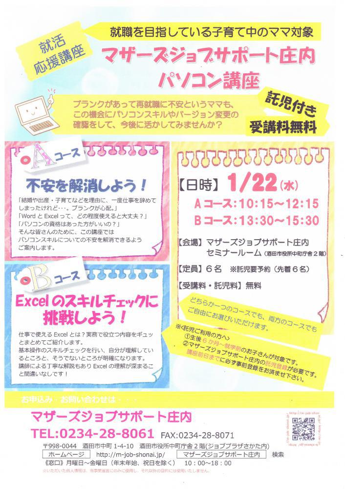 ☆マザーズジョブサポート庄内主催☆再就職応援『パソコン講座』のお知らせ ◇Aコース◇ 1月22日(水)10:15〜12:15『不安を解消しよう!』「求人票の"パソコンが使える方"ってどの程度?」「仕事では、どのくらいのパソコンのスキルが求められるの?」「WordとExcelって、どの程度使えると大丈夫?」などいろいろな不安がありますよね… パソコンについての"これから"を考えるきっかけに♪ ◇Bコース◇ 1月22日(水)13:30〜15:30『Excelのスキルチェックに挑戦しよう!』仕事で使えるExcelとは?実務で役立つ内容をギュッとまとめてご紹介します。基本操作のスキルチェックを行い、自分が理解しているところとそうでないところが明確になります。講師による丁寧な解説もありExcelの理解が深まること間違いなしです! ♪片方のコースのみ、両方のコース、どちらの受講でも可能です♪ ※本セミナーは「雇用保険受給中の求職活動実績」として認められます。 【対 象】就職を目指している子育て中のママ※就職活動前で何かを始めたい方でもOK【会 場】マザーズジョブサポート庄内 セミナールーム【料 金】受講料 及び 託児料 無料【定 員】先着6名 ※お申込みが必要です。【託 児】定員6名 ※事前登録・予約が必要です。 【駐車場について】お車でお越しの際は、中町庁舎脇にある〈セントラルホテル契約駐車場〉をご利用ください。(ジョブプラザさかたと表示してあります。)※契約駐車場が満車の場合は、酒田市中央地下駐車場をご利用ください。酒田市中央地下駐車場をご利用の方は、無料駐車券(最大2時間)を発行いたします。お帰りの際に、コンシェルジュ窓口へお声がけください。 お気軽にお問い合わせください♪ ◇お申込み・お問い合わせ◇マザーズジョブサポート庄内TEL:0234-28-8061