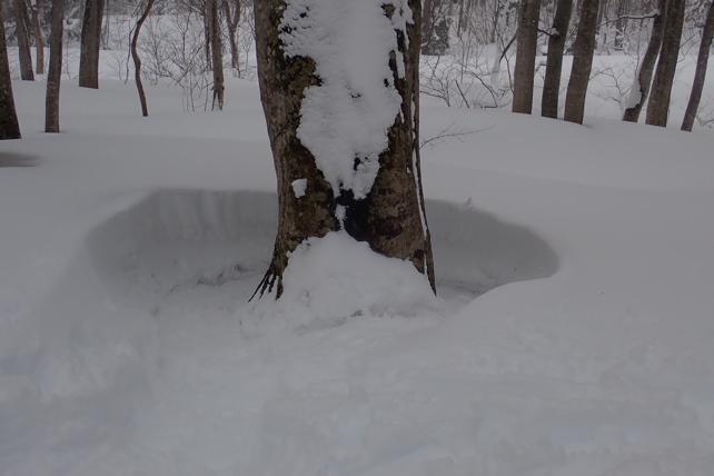 2月の厳冬でないと体験出来ない風景です。春先は雪解けの「根開け」が見られますがこれは厳寒に舞う北風による(風が回る)仕業です。底は会員の足跡ですが周りの円形は自然です。