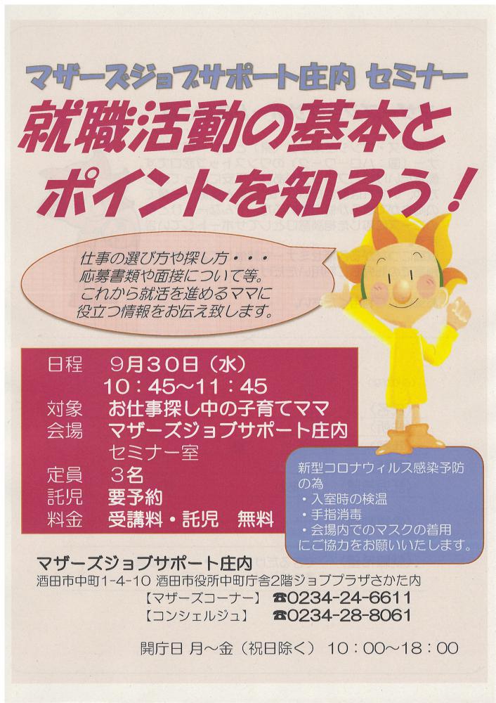 9月『マザーズジョブサポート庄内求職支援セミナー』『就職活動の基本とポイントを知ろう!』を行います! 就職活動を始めるための基本とポイントを学んでみませんか?★仕事の選び方や探し方★応募書類や面接について など 就活を進めるママに役立つ情報をお伝えします。 ハローワークマザーズコーナーでは定期的にセミナーを開催します。奮ってご参加下さい。受講後も疑問点など、窓口にてご相談が受けられます。☆雇用保険受給者の方は求職活動実績にカウント出来ます☆ 【日 時】9月30日(水)10時45分〜11時45分【対 象】お仕事探し中の子育てママさん【会 場】マザーズジョブサポート庄内セミナールーム【料 金】受講料 及び 託児料 無料【定 員】先着3名※お申込みが必要です。【託 児】定員3名※事前登録・予約が必要です。※併設の保育ルームで、保育スタッフがお子さんをお預かりします。ママは安心して受講いただけます。 【駐車場について】お車でお越しの際は、中町庁舎脇にある〈セントラルホテル契約駐車場〉をご利用ください。(ジョブプラザさかたと表示してあります。)※契約駐車場が満車の場合は、酒田市中央地下駐車場をご利用ください。無料駐車券(最大2時間)を発行いたします。お帰りの際に、マザーズ窓口へお声がけください。 どうぞ、お気軽にお問合せくださいね。 ◇お申込み・お問い合わせ◇マザーズジョブサポート庄内<ハローワークマザーズコーナー>TEL:0234-24-6611<コンシェルジュコーナー>TEL:0234-28-8061開庁日 月〜金(祝日除く)10:00〜18:00