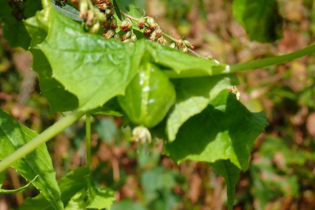 寒くなると今時期開花し、実を結ぶミヤマニガウリは自分の葉で花序を筒も込み夜の寒さから守ってくれます。