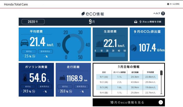 ホンダトータルケアに登録すると、1回走行ごとの距離数と燃費が自動で記録されていて、このように見ることが出来る。便利。9月1ヶ月の記録です。