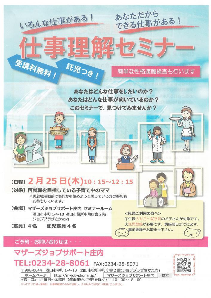 マザーズジョブサポート庄内主催『仕事理解セミナー』のお知らせです。 自分はどんな仕事をしたいのか?どんな仕事が向いているんだろうか?こんな気持ちを持っている方にピッタリのセミナーです!就職状況や、いろいろな職業を知り、簡単な適職診断をやってみて自分の適性をさぐってみましょう。実務経験者のママの声を参考に、仕事内容、必要とされるスキル、やりがいの一例を紹介します! 【日 時】2月25日(木)10時15分〜12時15分 【対 象】就職を目指している子育て中のママ※就職活動前でも何かを始めたいと思っているママもOK 【会 場】マザーズジョブサポート庄内セミナールーム【受講料・託児料】無料【定 員】先着4名【託児定員】最大4名 ※事前にご登録と利用予約が必要です。 ★★受講者の皆様へお願い★★新型コロナウイルス拡大防止のため、・入室時の検温・手指の消毒・会場でのマスク着用・距離をとっての対応・定期的な換気にご協力お願いいたします。★★ーーーーーーーーーーーー★★ 【駐車場について】お車でお越しの際は、中町庁舎脇にある〈セントラルホテル契約駐車場〉をご利用ください。(ジョブプラザさかたと表示してあります。)※契約駐車場が満車の場合は、酒田市中央地下駐車場をご利用ください。無料駐車券(最大2時間)を発行いたします。お帰りの際に、コンシェルジュ窓口へお声がけください。 ◇お申込み・お問い合わせ◇マザーズジョブサポート庄内TEL:0234-28-8061