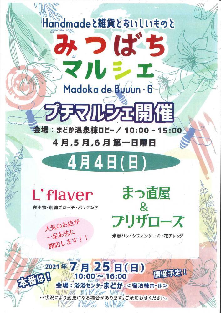 みつばちプチマルシェ開催!!4月・5月・6月 第一日曜日人気のお店が一足先に開店します。日にち:4月4日(日)場所:まどか温泉棟ロビー時間:10:00〜15:00●L’Flaver(布小物・刺繍ブローチ・バッグなど)●まっ直屋&プリザローズ(米粉パン・シフォンケーキ・花アレンジ)7月25日(日)が一年に一度のいつもの「みつばちマルシェ」開催予定です!それまで待ちきれない方々、ぜひ人気のお店が4月〜6月の第一日曜日に来てくれます。4月4日(日)は上記店さんが来ますよ♪