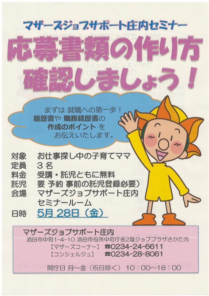 5月 マザーズジョブサポート庄内 求職支援セミナー『応募書類の作り方 確認しましょう!』 を行います! このセミナーは就職への第一歩! 履歴書・職務経歴書のポイント をお伝えします。 ハローワークマザーズコーナーでは 定期的にセミナーを開催します。 奮ってご参加下さい。 受講後も疑問点など、 窓口にてご相談が受けられます。☆雇用保険受給者の方は 求職活動実績にカウント出来ます☆ 【日 時】 5月28日(金) 10時45分〜11時45分【対 象】 お仕事探し中の子育てママさん【会 場】 マザーズジョブサポート庄内 セミナールーム【料 金】 受講料 及び 託児料 無料【定 員】先着3名 ※お申込みが必要です。【託 児】定員3名 ※事前登録・予約が必要です。 ※併設の保育ルームで、保育スタッフが お子さんをお預かりします。 ママは安心して受講いただけます。 【駐車場について】 お車でお越しの際は、中町庁舎脇にある〈セントラルホテル契約駐車場〉をご利用ください。(ジョブプラザさかたと表示してあります。) ※契約駐車場が満車の場合は、 酒田市中央地下駐車場をご利用ください。 ご利用の方は、無料駐車券を(最大2時間) を発行いたします。 お帰りの際に、マザーズ窓口へお声がけください。 どうぞ、お気軽にお問い合わせくださいね。 ◇お申込み・お問い合わせ◇ マザーズジョブサポート庄内 TEL:0234-24-6611(マザーズコーナー) TEL:0234-28-8061(コンシェルジュコーナー)