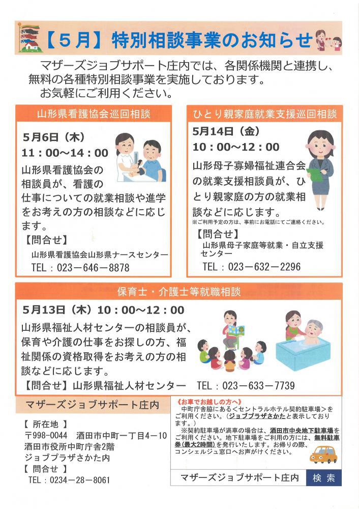 マザーズジョブサポート庄内では、各関係機関と連携し、各種特別相談事業を実施しております。ぜひ、ご利用ください。 山形県看護協会巡回相談※予定していた5月6日は中止となりました。※お申し込み不要日 時 5月6日(木)11:00〜14:00場 所 マザーズジョブサポート庄内 セミナールーム問合せ 山形県看護協会 пF023-646-8878HP:http://www.nta.or.jpurse-yamaga/看護の仕事への復職をお考えの方、お気軽にご相談ください。 保育士・介護士等就職相談※予定していた5月13日は中止となりました。※お申し込み不要日 時 5月13日(木)10:00〜12:00場 所 マザーズジョブサポート庄内 セミナールーム問合せ 山形県福祉人材センター пF023-633-7739HP:https://www.ymgt-shakyo.or.jp/jinzai/保育士・介護士・看護師など資格をお持ちの方や、資格取得を目指している方、福祉職にご関心のある方は、お気軽にお越しください。 ひとり親家庭就業支援相談 [要予約]日 時 5月14日(金)10:00〜12:00場 所 マザーズジョブサポート庄内 セミナールーム問合せ 山形県母子家庭等就業 ・自立支援センター пF023-632-2296HP:http://www.y-boshi.com/self-support/ひとり親家庭の方や今後について考えている方、どうぞお気軽にお越しください。 ※各相談会について、利用ご希望の方は、マザーズジョブサポート庄内までお気軽にお声掛けください。※ご相談の際、お子さまの託児は『保育ルーム きらきら』をご利用いただけます。託児ルームのご利用には、事前のご登録が必要です。 【駐車場について】お車でお越しの際は、中町庁舎脇にある〈セントラルホテル契約駐車場〉をご利用ください。(ジョブプラザさかたと表示してあります。)※契約駐車場が満車の場合は、酒田市中央地下駐車場をご利用ください。無料駐車券(最大2時間)を発行いたします。お帰りの際に、コンシェルジュ窓口へお声がけください。 ◇お申込み・お問い合わせ◇マザーズジョブサポート庄内TEL:0234-28-8061