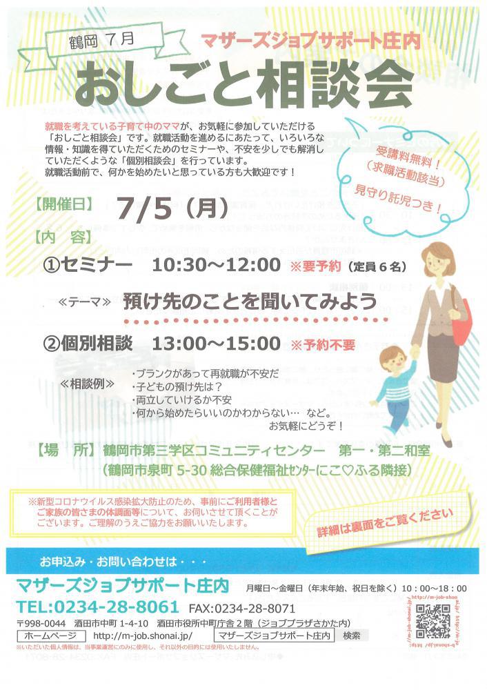 ●7月マザーズおしごと相談会in鶴岡開催のお知らせ