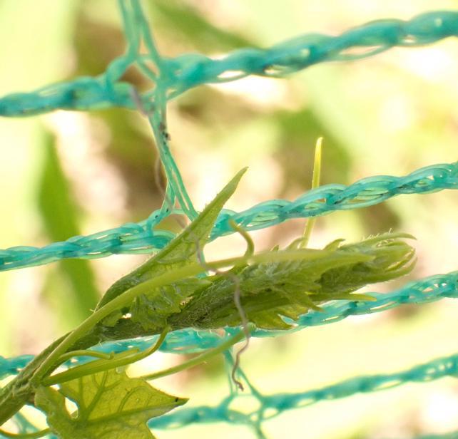 ミヤマニがウリの成長のし方として巻ひげの伸びと数枚の葉がきりっと絡み合って方向性を見定めて成長しているのが解る。 ミヤマニがウリの先端部に注目してみる。幾重にも筒状に規則正しく丸まり伸びそしてほぐれていく。葉腋からの巻きひげが先頭に立ち進路を確かめながら絡まりで成長する。写真はその成長過程である。