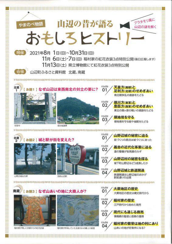 ふるさと資料館では、ブラタモリ風に山辺の謎を解く「山辺の昔が語るおもしろヒストリー」を展示公開しています。お題1「なぜ山辺は東西南北の対立の要に?」、お題2「城と駅が街を変えた?」、お題3「なぜ山あいの地に大商人が?」の3つのお題に関するそれぞれの展示・各ルートの説明を北蔵、南蔵に展示しています。稲村家所有の全幅10メートルもの「最上川絵図」、江戸時代の山野辺絵図、杉下武士団の日天旗・月天旗なども特別公開しています。また、「お題2」を巡るツアーの開催を9月18日(土)に行います。実際に町内を歩きながら、詳しい説明を聞くことができます。ぜひ、この機会に山辺町の歴史に触れてみてはいかがでしょうか! ■3つのお題に関する展示、各ルートの説明期間:2021年8月1日(日)〜10月31日(日)時間:9:30〜16:30場所:ふるさと資料館 北蔵・南蔵休館日:月曜日、祝日入館料:大人200円 学生100円 小人50円■「お題2」を巡るツアー日時:9月18日(土)@9:00〜11:00 A13:00〜15:00参加料:500円(保険代・資料代)募集人数:各回とも20名以内申込先:ふるさと資料館 TEL/023−664−5033 FAX/023−664−5377