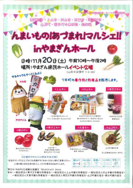 11月20日(土)に、やまぎん県民ホールイベント広場にて「んまいもの!あづまれ!マルシェ!1」が開催されます。村山広域7市町の農作物と物産品を販売します。山辺町からは、町の特産品でもある要害の鯉の甘煮を販売します。皆様のお越しをお待ちしております♪ んまいもの!あづまれ!マルシェ!!inやまぎんホール日時:11月20日(土)時間:午前10時〜午後2時場所:やまぎん県民ホールイベント広場お問い合わせ:やまがた広域観光協議会 TEL023−621−8446