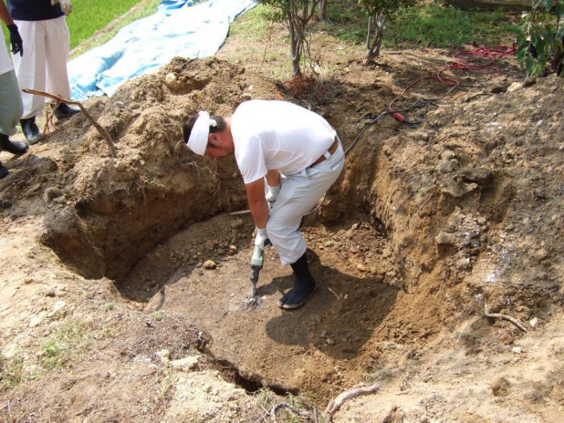 打ち合わせでは、どこに埋めたかの記憶も曖昧で、さらに埋めた数年後に盛り土をし周りに木を植えたとの事で、当時の写真をたよりに前もって場所を確認し、本日の発掘となりました。