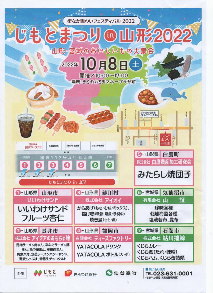 2022年 10/8(土)じもとまつりin 山形2022山形・宮城のおいしいもの大集合 時間 : 10:00〜17:00会場: きらやか銀行SBIマネープラザ前出展会場: 国道112号歩行者天国 D-山形県白鷹町 みたらし焼団子 みなさまのお越しをお待ちしております。