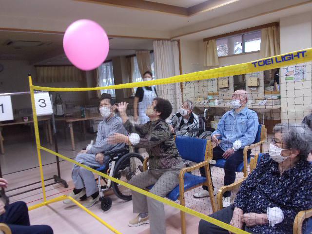 11月の行事は、風船バレー大会を行いました。1チーム6人程の小グループに分けた事で、全員が風船に触る事ができ、楽しめたようです。最後は、職員4人vs利用者さんチームで対戦し、大盛り上がりでした(^^)