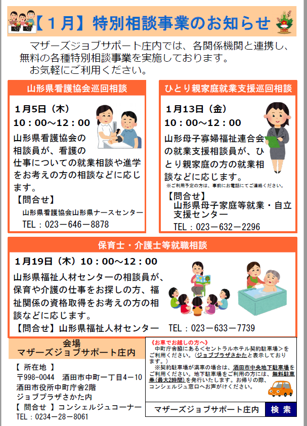 マザーズジョブサポート庄内では、各関係機関と連携し、各種特別相談事業を実施しております。ぜひ、ご利用ください。  山形県看護協会巡回相談 【要予約】日 時   1月5日(木)10:00〜12:00場 所  マザーズジョブサポート庄内 セミナールーム問合せ  山形県看護協会 пF023-646-8878HP:http://www.nurse-yamagata.or.jp/ 看護の仕事への復職をお考えの方、お気軽にご相談ください。    保育士・介護士等就職相談 ※お申し込み不要日 時  1月19日(木)10:00〜12:00場 所  マザーズジョブサポート庄内 セミナールーム問合せ  山形県福祉人材センター      пF023-633-7739HP:http://www.ymgt-shakyo.or.jp/jinzai/保育士・介護士・看護師など資格をお持ちの方や、資格取得を目指している方、福祉職にご関心のある方は、お気軽にお越しください。  ひとり親家庭就業支援相談 [要予約]日 時 1月13日(金)10:00〜12:00場 所 マザーズジョブサポート庄内 セミナールーム問合せ 山形県母子家庭等就業・自立支援センター     пF023-632-2296HP:http://www.y-boshi.com/self-support/ひとり親家庭の方や今後について考えている方、どうぞお気軽にご相談ください。 ※各相談会について、利用ご希望の方は、マザーズジョブサポート庄内までお気軽にお声掛けください。※ご相談の際、お子さまの託児は『保育ルーム きらきら』をご利用いただけます。託児ルームのご利用には、事前のご登録が必要です。  【駐車場について】お車でお越しの際は、中町庁舎脇にあるセントラルホテル契約駐車場をご利用ください。(ジョブプラザさかたと表示してあります。)※契約駐車場が満車の場合は、酒田市中央地下駐車場をご利用ください。無料駐車券(最大2時間)を発行いたします。お帰りの際に、コンシェルジュ窓口へお声がけください。 ◇お申込み・お問い合わせ◇マザーズジョブサポート庄内TEL:0234-28-8061メールでのお申込みはコチラ