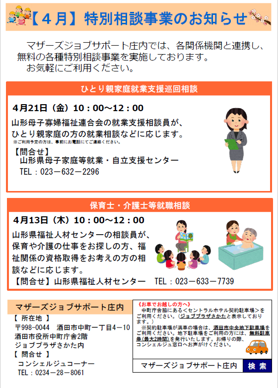 マザーズジョブサポート庄内では、各関係機関と連携し、各種特別相談事業を実施しております。ぜひ、ご利用ください。  保育士・介護士等就職相談 ※お申し込み不要日 時  4月13日(木)10:00〜12:00場 所  マザーズジョブサポート庄内 セミナールーム問合せ  山形県福祉人材センター      пF023-633-7739HP:http://www.ymgt-shakyo.or.jp/jinzai/保育士・介護士・看護師など資格をお持ちの方や、資格取得を目指している方、福祉職にご関心のある方は、お気軽にお越しください。  ひとり親家庭就業支援相談 [要予約]日 時 4月21日(金)10:00〜12:00場 所 マザーズジョブサポート庄内 セミナールーム問合せ 山形県母子家庭等就業・自立支援センター     пF023-632-2296HP:http://www.y-boshi.com/self-support/ひとり親家庭の方や今後について考えている方、どうぞお気軽にご相談ください。 ※各相談会について、利用ご希望の方は、マザーズジョブサポート庄内までお気軽にお声掛けください。※ご相談の際、お子さまの託児は『保育ルーム きらきら』をご利用いただけます。託児ルームのご利用には、事前のご登録が必要です。  【駐車場について】お車でお越しの際は、中町庁舎脇にあるセントラルホテル契約駐車場をご利用ください。(ジョブプラザさかたと表示してあります。)※契約駐車場が満車の場合は、酒田市中央地下駐車場をご利用ください。無料駐車券(最大2時間)を発行いたします。お帰りの際に、コンシェルジュ窓口へお声がけください。 ◇お申込み・お問い合わせ◇マザーズジョブサポート庄内TEL:0234-28-8061メールでのお申込みはコチラ