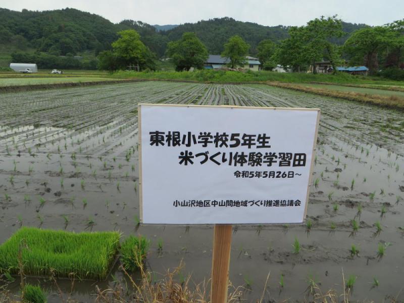 5月26日(金)、雨で延期となっていた5年生の田植え体験を行いました。 5,6分程歩くと学校田に到着です。すでに、地域の田んぼの先生方が準備をして待っていてくださいました。お話をお聞きして…いざ田んぼに突入〜!泥の上にひいてある線にそって丁寧に植えていきます。思うように身動きが取れず、ぎこちない動きですが、丁寧に植えていきます。「おっーっとっと‥」「あ、あぶない!」あちらこちらから聞こえてくる声にハラハラドキドキ。「あ〜体幹が鍛えられるぅ〜。」そんな一言も。でも、時間が経つにつれて…次第にコツを掴んできたようです。まるで田植え機のようにテンポよく正確に植える子も…。「おっ、上手だねぇ。」と田んぼの先生にも褒めていただきました。とはいえ、人間ですから、時々背筋を伸ばさないと腰が痛くなりますね。そして、無事終了。田んぼからあがろうとすると、何やら生き物を発見!どうやらタニシのようです。普段あまり見かけないせいか興味津々…。 ご褒美のジュースもいただき大満足でした! これで、5年生の田んぼの学習が本格的にスタートすることとなります。苗の成長と共に、稲作や地域の伝統「畔藤田植えおどり」について理解を深めていって欲しいと思います。ご指導いただきました、小山沢地区中山間地域づくり推進協議会の皆様、ありがとうございました。 <おまけ> 帰り道…大漁大漁♪ (^―^)
