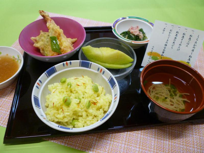 栄養課です。白鷹町のお花シリーズ第二弾、ちょっと一足先に、「紅花御膳」を提供しました。・紅花ごはん・紅花のお吸い物・紅花衣の天ぷら・おかひじきの姫ゆばかけ・メロンと、紅花づくしの御膳でした。 紅花はお茶にして飲むと、体を温め血液の循環を良くする働きがあります。更に、抗酸化作用があるビタミンEなどが多く含まれるので、高血圧症、動脈硬化予防脂質異常症予防と様々な効果があります。 白鷹町は紅花の生産量が日本一と言われ、町の至る所に紅花が栽培されてます。7月には紅花まつりも開催されますので、是非起こし下さい。