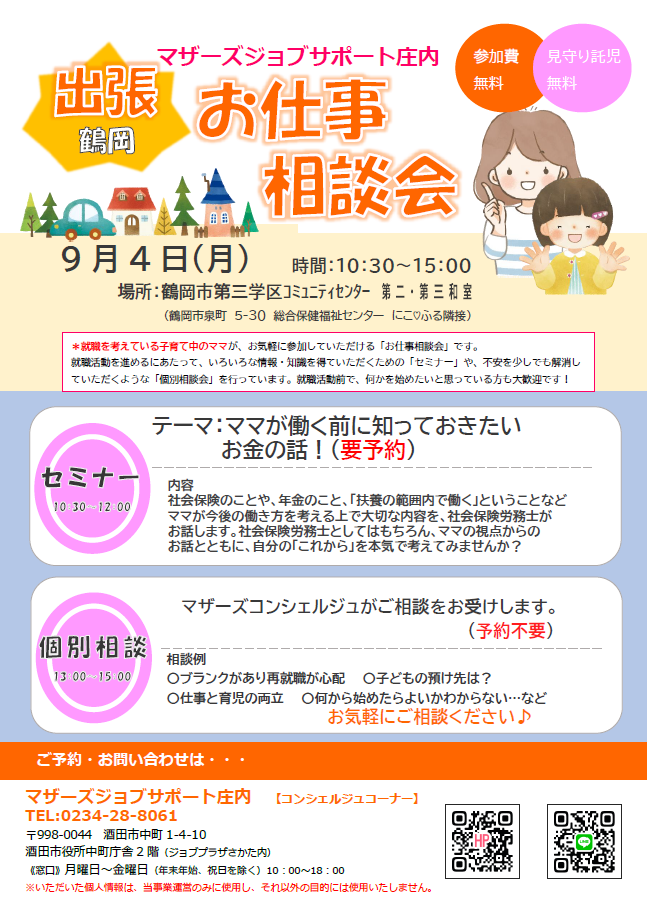 マザーズジョブサポート庄内おしごと相談会 in 鶴岡を開催します。【開催日】9月4日(月)【開催場所】鶴岡市第三学区コミュニティセンター 第二・第三和室(鶴岡市泉町5-30 総合福祉センターにこふる隣接) 【内容】10:30〜12:00 セミナー テーマ「ママが働く前に知っておきたいお金の話」社会保険のことや、年金のこと、「扶養の範囲内で働く」ということなどママが今後の働き方を考える上で大切な内容を、社会保険労務士がお話します。※お申込みが必要です。13:00〜15:00 個別相談会・おしごとに関するお悩み・子育てに関すること・仕事と家事、子育てとの両立 など、お気軽にご相談ください。※どなたでもご利用いただけます、お申込みは不要です。 ♪お子さんと一緒に、お気軽にお越しください♪お子さんと同じお部屋でセミナーを受講し、相談することができます。保育スタッフが、ママをサポートいたします。 ★★利用者の方へお願い★★場合によっては、体調の確認をさせていただくことがございます。状況によっては、ご案内の変更をさせていただきます。あらかじめご了承ください。★★ーーーーーーーーーーーー★★どうぞ、お気軽にお問い合わせくださいね。 ◇お申込み・お問い合わせ◇マザーズジョブサポート庄内TEL:0234-28-8061メールでのお申込みはコチラ