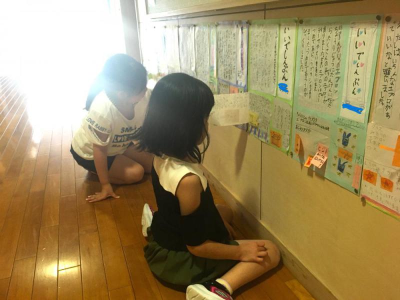 2年生が、先日見学した調理場について新聞にまとめたようです。グループごとに交代しながら、廊下に掲示してある友達の新聞を見ていました。見て聞いてきたことを、しっかりと文章やクイズにしており、興味深そうにしていました。他のグループの子供たちは、教室で昔の遊び「おはじき」「メンコ」をして楽しんでいました。