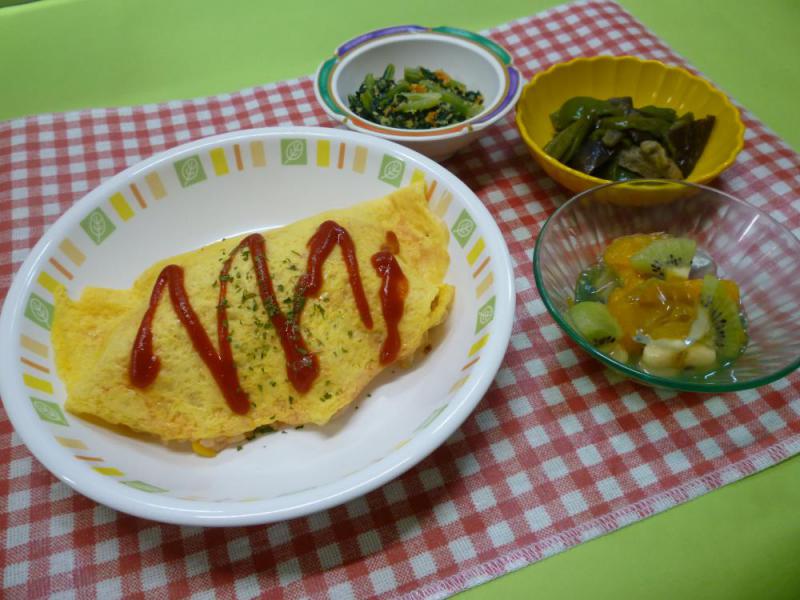 栄養課です。 7月のお誕生日献立は、・オムライス・茄子炒め・小松菜のピーナッツ和え・フルーツポンチでした。 少々ハイカラな献立だったので、皆さんがお気に召すか心配でしたが、「オムライスだなー」とハイカラな方もいらっしゃって、皆さん問題なくお召し上がりました。 みゆき通所リハビリステーションでは、オムライスに利用者様のお名前をケチャップで書き、見た瞬間、「うわ〜」と歓声があり、大変喜ばれておりました。