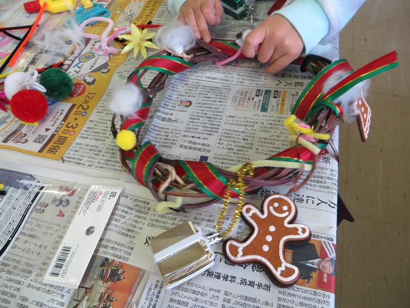 12月12日(火)、1・2年生が秋に収穫したさつまいものツルを使ってクリスマスリース作りを行いました。 事前に円く編んでおいた土台にそれぞれ飾り付けをしていきます。使っている材料は様々です。どれどれ・・・「見て見て!こんな材料使ったよ!」 どの子も、まもなくやってくるクリスマスに思いを馳せながら、嬉しそうな表情 & 真剣な眼差しで、思い思いのリースを作っていました。素敵なクリスマスになるといいですね♪