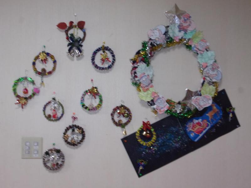 今年も残すところあと10日余りとなりました。先週まで暖かかった白鷹町も数日前から冷たい風が吹き、雪も舞うようになってきました。屋根の上や日陰などには雪が残っている所もあり、いよいよ本格的な冬の訪れを感じています。さて、今週末はクリスマス☆先日もツリーの飾りつけをしている様子をアップしましたが、今回は玄関に飾ったクリスマスリースをアップします。一つ一つ、利用者様が飾りつけをして下さいました。写真では少し見づらいかもしれませんが可愛らしいリースがたくさん出来上がりましたよ。