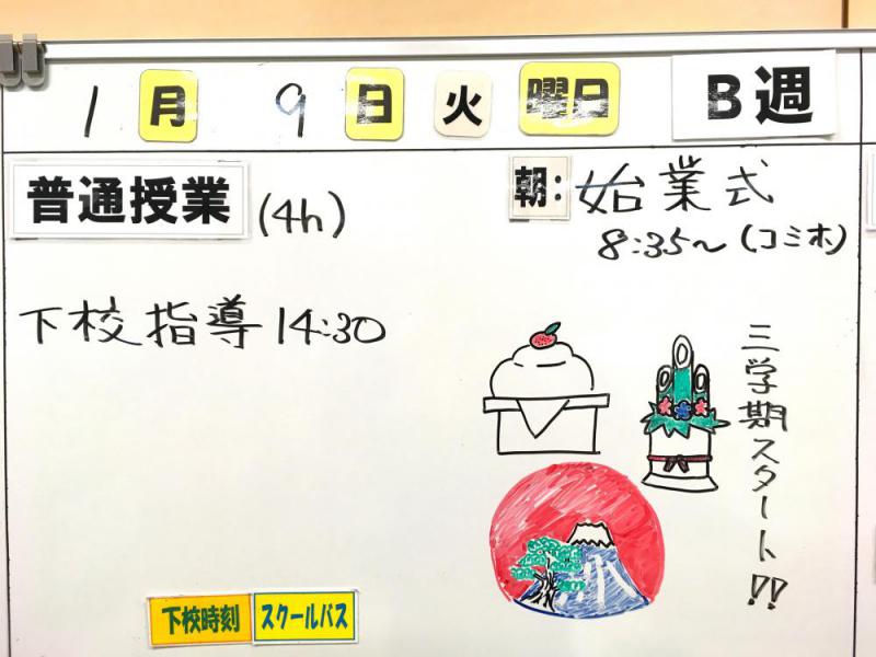 今日から3学期の始まりです。子供たちは元気に登校してきました。教室の黒板では、各担任からのメッセージで子供たちを迎えたところです。短い3学期ですが、目標と感謝の心をもって次の学年に向かってほしいと思います。