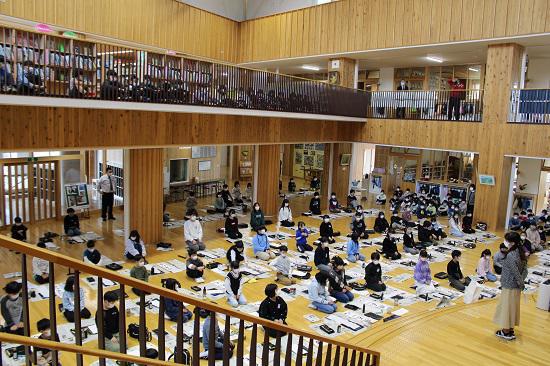 1月10日、書き初め大会が行われました。 場所は、1.2年生が各教室、3,4,6年生が1階ホール、5年生が2階図書スペースで行いました。1年生は、鉛筆を正しく持って、「お正月に、おぞうにをたべました。からだがぽかぽかしました。」という長文に挑戦。2年生は、習字用ペンを正しく持って、「楽しいお正月」の文字を納得いくまで何枚も書いている子もいました。3年生以上は毛筆です。3年生のテーマは、「友だち」。4年生は、「明るい心」。5年生は、「新しい風」。そして6年生は、「将来の夢」。3〜6年生はフロアにひざまずき、立腰の姿勢を意識しながら、丁寧に取り組んでいました。全校生の力作は、1月16日(火)〜2月2日(金)までの間、センターホールに掲示します。ぜひご来校くださり、ご覧いただければと思います。(後日、学校より作品展のお知らせをお渡します。)