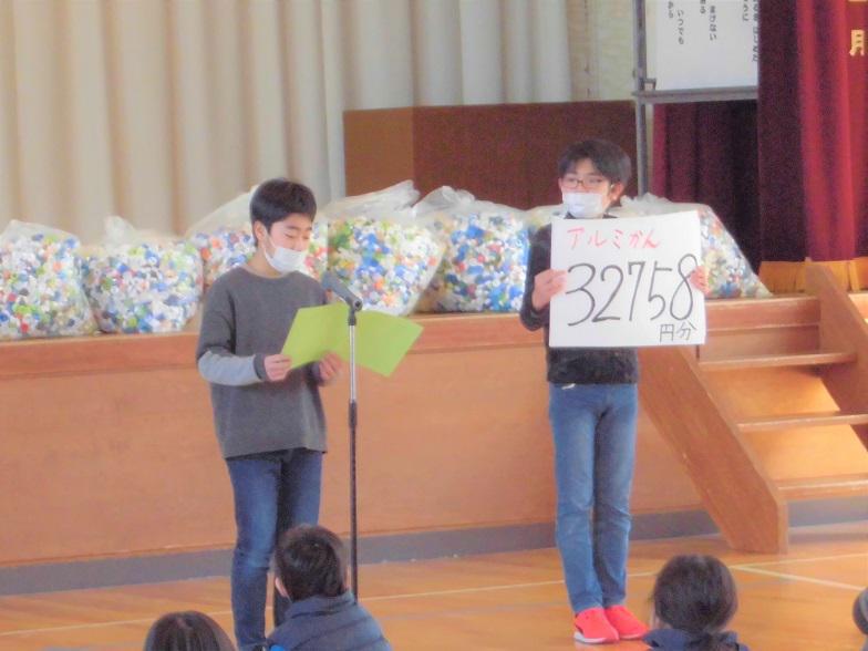 2月16日(金)、ふれあいの里・菅原様、トヨタカローラ長井店・本間様にご来校いただき、「福祉用品贈呈式・ペットボトルキャップ引渡し式」を行いました。この1年間、運営委員会が中心となって進めてきた「アルミ缶・ペットボトルキャップ回収活動」の成果を全校生で確認するとともに、子供たちの思いと成果物をそれぞれ菅原様、本間様にお預けしました。 アルミ缶回収については、収益金 32,758円でシャワーベンチとパルスオキシメーターを購入し、ふれあいの里さんに贈呈しました。シャワーベンチは安全に楽に入浴をするための椅子として、パルスオキシメーターは普段の健康管理のための機器としてお使いいただきます。 ペットボトルキャップ回収については、170kg(およそ68,000個)をトヨタカローラ長井店さんにお渡ししました。この量で、80人以上の子供たちの命を救うワクチンに換えることができことができます。トヨタカローラ様からは感謝状を頂戴しました。 一人一人の小さな思いも、みんなで集めれば大きな成果になります。多くの人の「笑顔」に繋がることをみんなで喜び合いました。