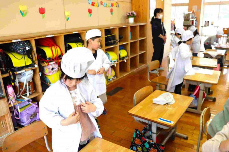 1年生の給食が本日から始まりました。3校時目から準備をして、初めての給食に臨みました。まずは給食当番の学習です。給食着を全員で一度着てみて、袋にしまう練習も上手にできました。盛り付けも配膳も、先生方の話をよく聞きながら進め、スムーズに進められたようです。小学校での初めての給食。みんなおいしそうに食べており、満足した様子でした。