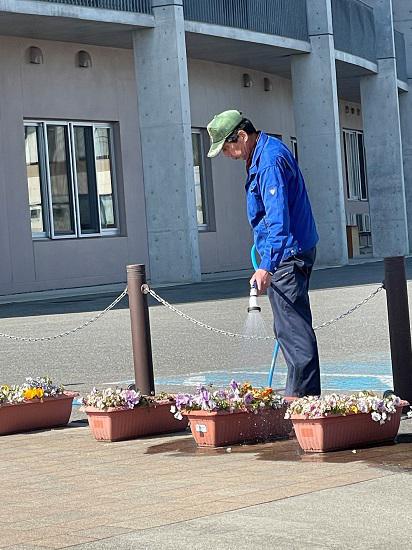 さわやかな晴天の下、一っ子たちの歓声が響いています。休み時間に安全に遊んだり、授業や諸活動で生き生きと取り組んだりと、ますます活気あふれる毎日です。その陰には、時間や天候に関係なく、環境を整備したり、活動しやすいように様々な準備をしたり、校内外に目を配り、お仕事をなさっている人がいます。学校技術員の巻坂先生です。私たちの目の届かないところに気づいてくださり、子ども達の安全・安心のために尽力いただいています。休日に水かけをしてくださっていたこともお聞きしました。本当に感謝です!!巻坂先生のように、誰も見ていなくても、誰かのために行動できる、そんな人になりたいものですね。道路沿いの花壇に、今年は紅花を植えてくださいました。2年生のミニトマト栽培。鉢の後ろの杭は巻坂先生のアイディア。この後、成長とともに支柱を立てて育てていきますが、そのままだと風で倒れやすくなってしまうので、倒れないように支柱を結びつけるのだそうです。頭が下がります。