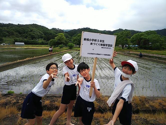 5月21日(火)、学習田を活用した5年生の米作り体験学習がスタートしました。今日は田植え体験です。少し肌寒さを感じる天気でしたが、元気いっぱいの5年生は半袖短パンでいざ田んぼへ! 泥と格闘しながらも、上手に苗を植えていました。今後は、稲の成長を観察するとともに、稲刈り、脱穀、しめ縄作りの体験を予定しています。さらに、地域の伝承芸能「畔藤田植踊り」にも取り組んでいきます。本物に触れる貴重な体験を通して、自ら学びを深めていって欲しいと願っています。ご指導いただきました、小山沢地区中山間地域づくり推進協議会の皆様、ありがとうございました!