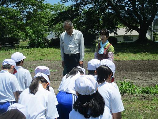 青空の下、先日植えたベニバナの成長を促す間引きの日。Kさんご夫妻のご指導で、「育てる」ことの学びです。「どれを残す?」「とったあとは、風で倒れないように土で補強するよ。」 間引きした葉は、給食の材料になります。教育委員会から2名おいでいただき、食べられるところを取るコツを教えていただいています。 すくすく育つ環境になったね!「先生、ベニバナの種のから!」「んだね、からがはじけて芽が出たんだね!」 「こっちも!」「おーっ、すごい発見!」 間引きの後、雑草取りがおもしろくなったYさん。「先生、今日帰ったら早く宿題やって、草取りすっかな!」「いいねえ、ばあちゃん助かるね〜。」「うん!」 いつの間にか草取りの仲間が増えて、他の学年の畑もきれいになっていました。根っこまで取れると、草取りもおもしろいね! きれいな花が咲くまでどう育つか、しっかり観察していきます。空は青く、空気も澄んだ中での「育てる」ための学習でした!