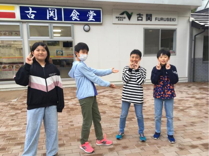 古関PAで休憩です。山の上なので少し寒いですが、みんな元気です。班ごとに記念撮影です。これからトヨタ工場に向かいます。