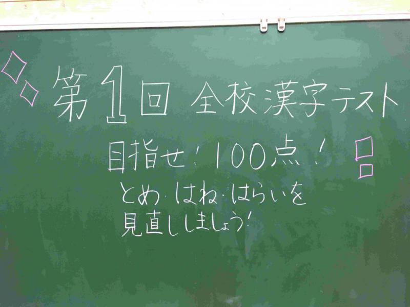 9日に全校漢字テスト(1年生は平仮名)を行いました。毎日練習してきた成果を試すときです。各教室をまわってみると、すごい集中力を感じました。撮影するのが申し訳ないくらいです。「カツカツ」と鉛筆の音だけが響く時間もステキなものだな、と感じたところです。すぐに担任に丸付けをしてもらって、100点をとって大喜びしている子供たちもいました。ただ、1回で100点をとれなくても、これまでがんばってきた経過は十分素晴らしいと思います。