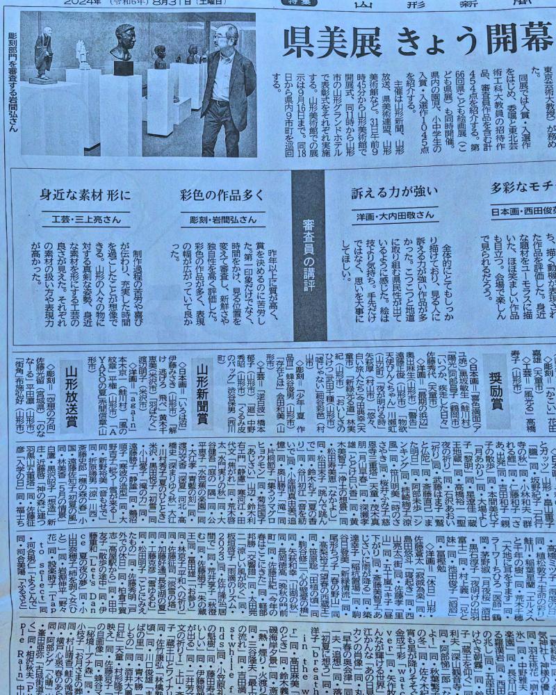 本日8月31日(土)より、9月16日(月)の16時まで山形美術館において『県美展』が開催中です!弊社スタッフからは吉田朝夫(委嘱)海老名真一(山形放送賞を受賞!)吉田朝頼(入選)無事、3点の展示になりました!!展示作品につきましては開催期間終了後に投稿をさせていただければと思っています。(ご都合よろしければ、是非実物をご覧になっていただきたいという不純な考えからきております。)