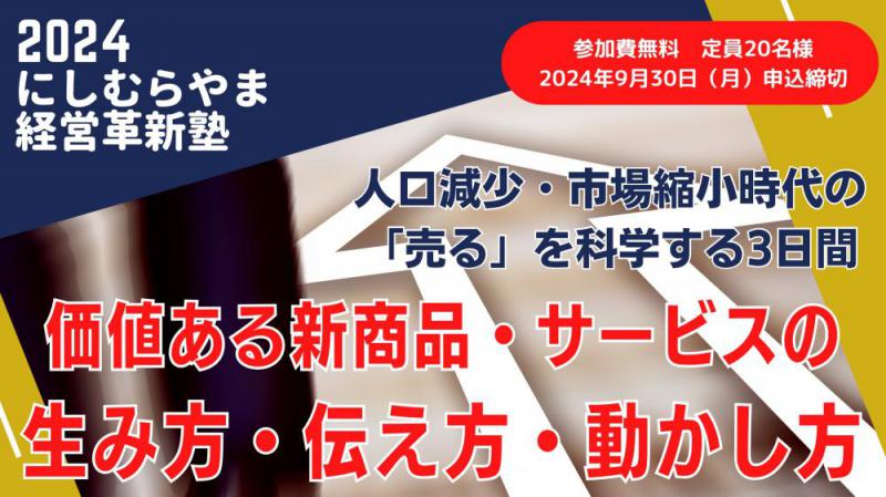 価値ある新商品・サービスの生み方・伝え方・動かし方を学んでみませんか? ○開催日時 <1日目> 10月 9日(水) 午後3時〜午後6時 <2日目> 11月 1日(金) 午後3時〜午後6時 <3日目> 11月18日(月) 午後3時〜午後6時 ○開催会場 ホテルサンチェリー(寒河江市本町1−2−23) TEL:0237-83-5000 ○講師 合同会社HIKIDUS 代表社員 尾上雄亮 氏 ○参加費 無料(※定員20名ですので、お早めにお申し込みください) ○申込方法 下記よりチラシデータをダウンロード頂き、必要事項を記入の上、FAXにより各所属商工会にお申し込みください。(※締切9月30日) <<<チラシデータダウンロード>>>